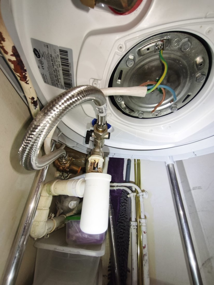 Trace d’humidité et coulure au centre d’un ballon d’eau chaude, signalant une micro-fuite de cuve : Plomberie BRB intervient à Boulogne Billancourt pour diagnostic rapide et remplacement du chauffe-eau.